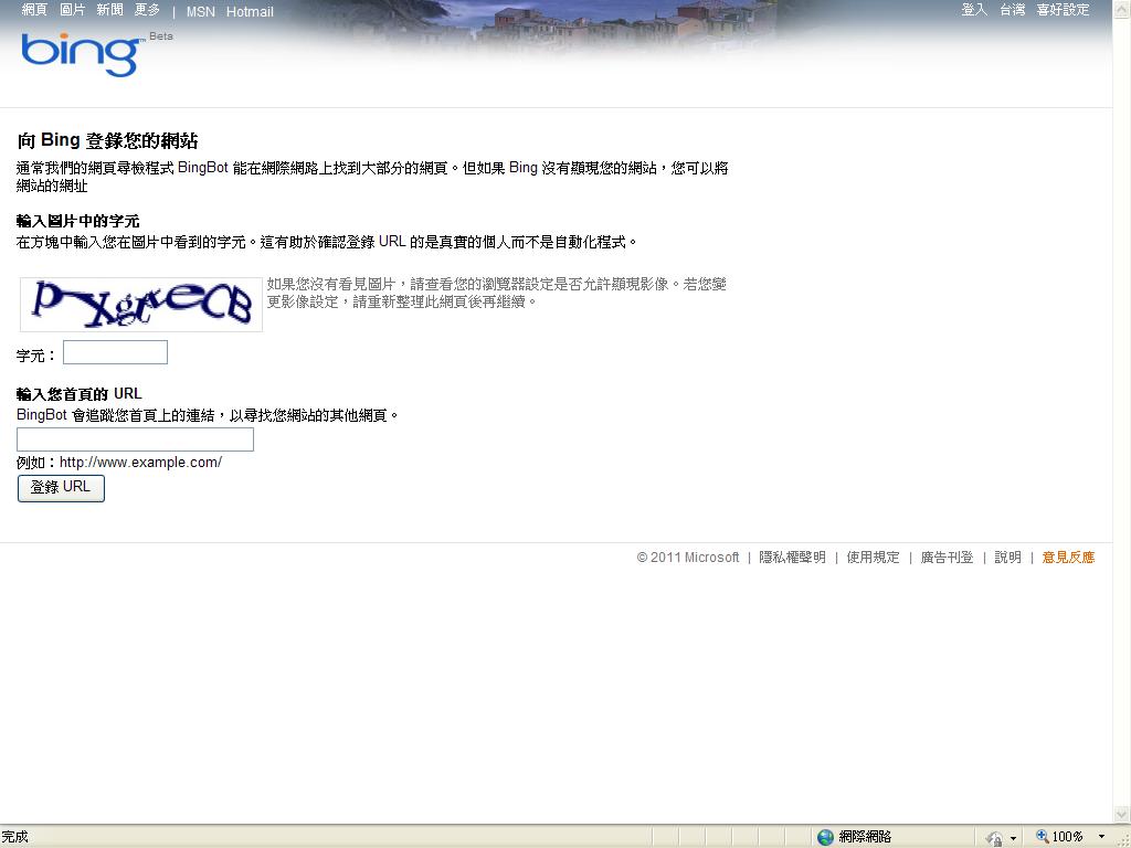 通常我們的網頁尋檢程式 MSNBot 能在網際網路上找到大部分的網頁。但如果 Bing 沒有顯現您的網站,您可以將網站的網址 (URL) 傳送給我們。輸入圖片中的字元 |