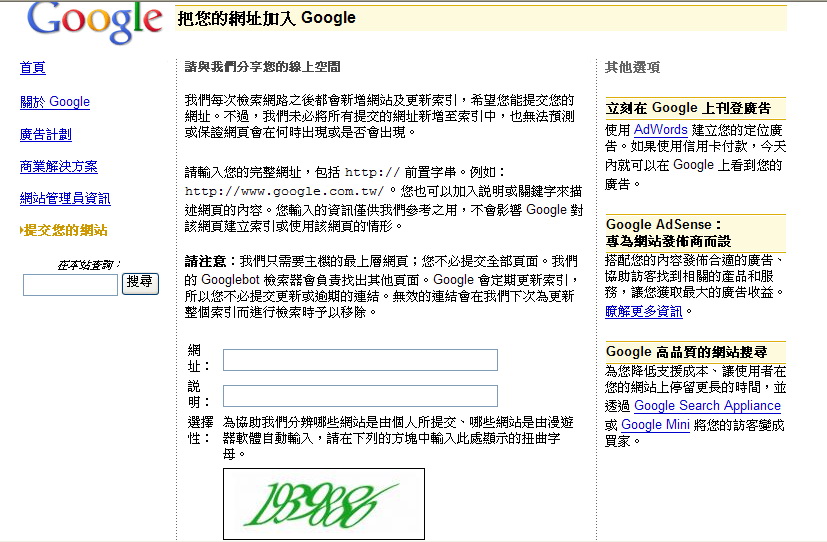 出發點來自這裡 www.google.com/addurl/(以Google 做為舉例)